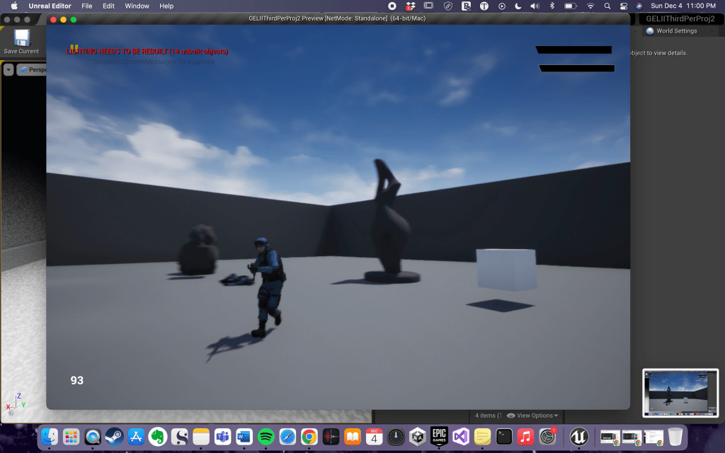 I implemented a first-person camera perspective on a third-person character framework, enabling immersive player control with the flexibility to incorporate third-person camera angles in future development. This approach allows seamless transitions between perspectives, enhancing cinematic opportunities and gameplay variety.
